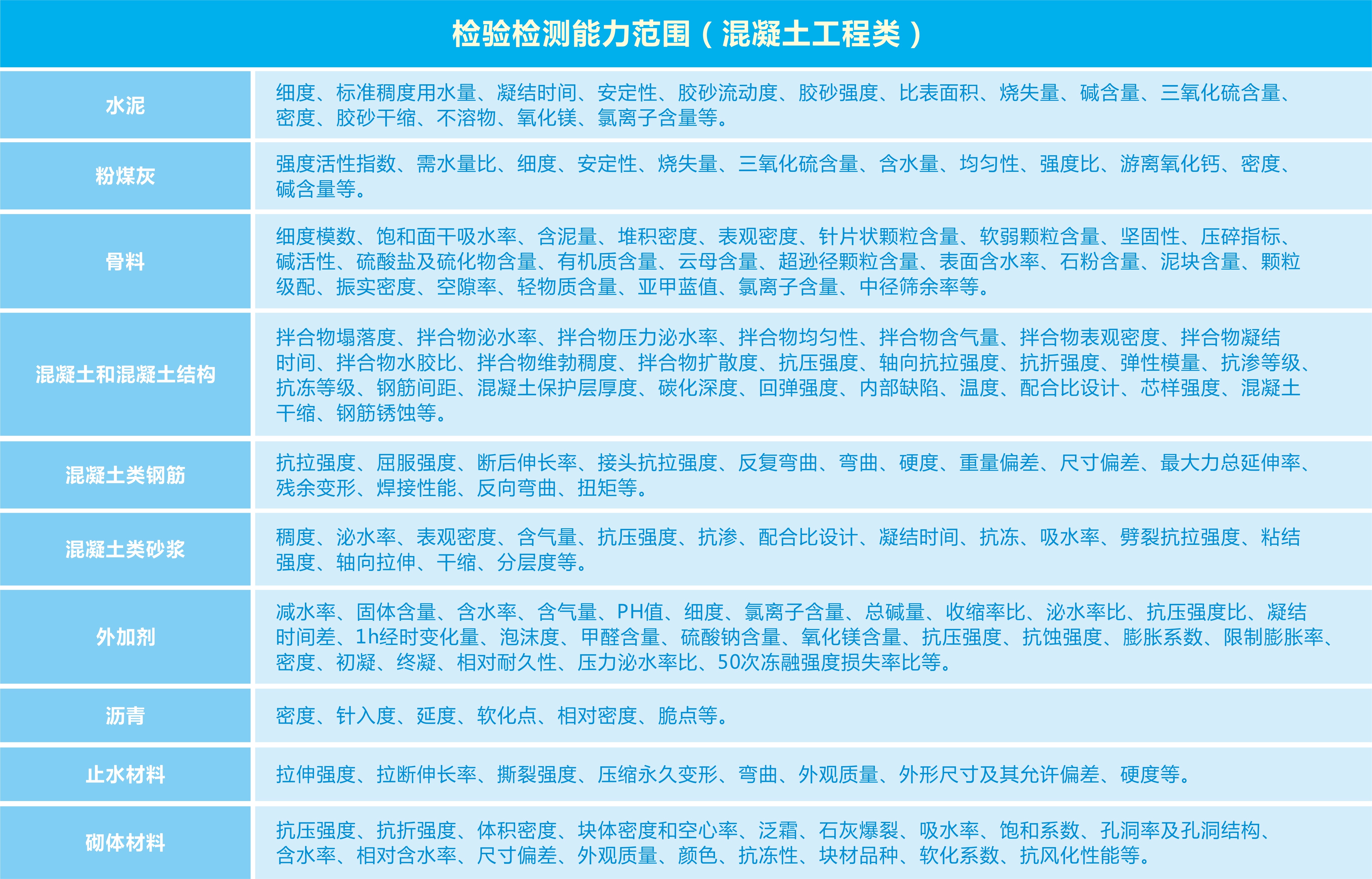 水工混凝土工程質(zhì)量檢測包含:原材料質(zhì)量檢測、混凝土拌合物性能檢測、混凝土物理力學(xué)性能檢測、混凝土耐久性能檢測、現(xiàn)場混凝土質(zhì)量檢測、砂漿性能檢測。